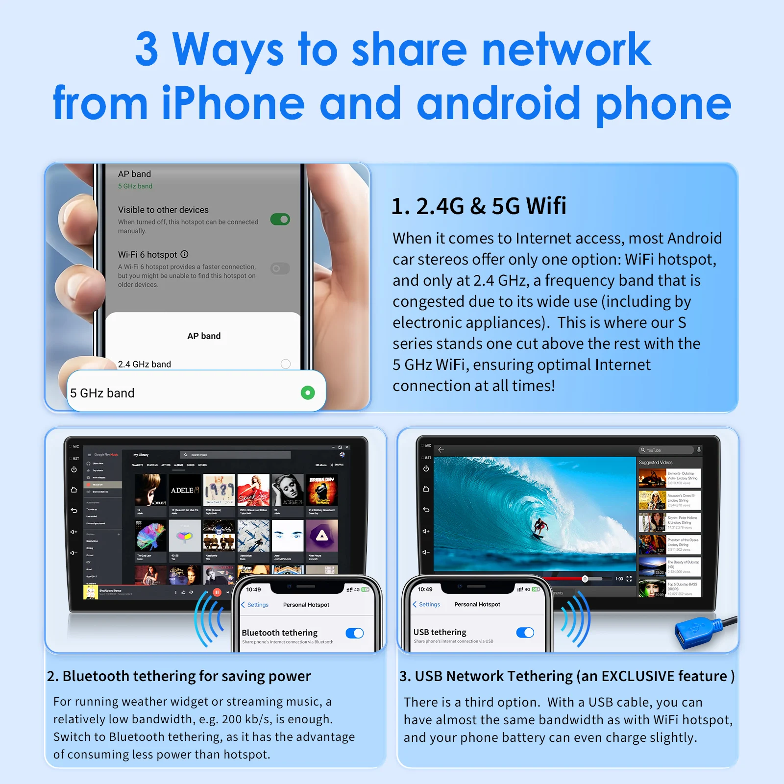 Support Carplay / Android auto: Phone / Music / Maps / Podcasts Make your journey easier and more fun. support wireless carplay,wired android auto,wireless android auto(which needs to set its cell phone wifi hotspot’s AP Band as 5 Ghz band).